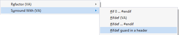 # surrounds with #ifdef or #region, depending on the language. In C/C++, the text editor prompts for a guard condition to the #ifdef.